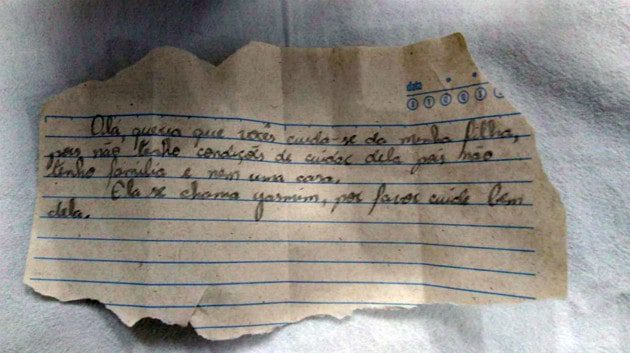 “Olá, queria que vocês cuidassem da minha filha, pois não tenho condições de cuidar dela, pois não tenho família e nem uma casa. Ela se chama Yasmin, por favor cuide bem dela.”